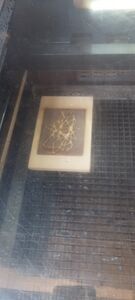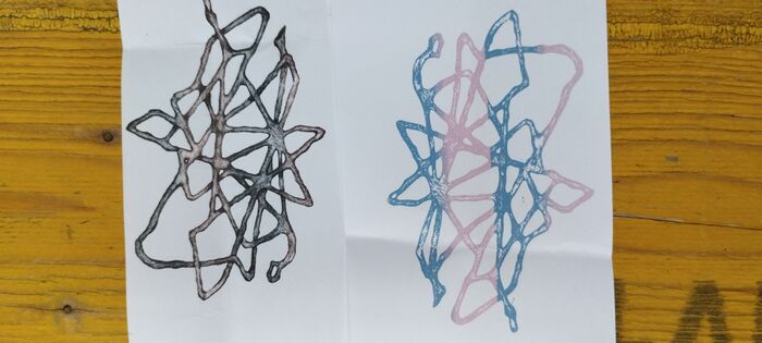 Les dessins que nous avons utilisés ont été réalisés par Alex, qui a l'habitude de dessiner, notamment pour évacuer son stress. Il nous a envoyé des photos de ses dessins, que nous avons vectorisés à l'aide d'un logiciel de dessin vectoriel (Adobe Illustrator/Inkscape). Nous avons ensuite envoyé les fichiers à une découpeuse laser et l'avons utilisée pour fabriquer des tampons en bois en retirant par gravure le matériau à l'extérieur des lignes des dessins. En raison de sa souplesse, les meilleurs résultats ont été obtenus avec du contreplaqué de peuplier.