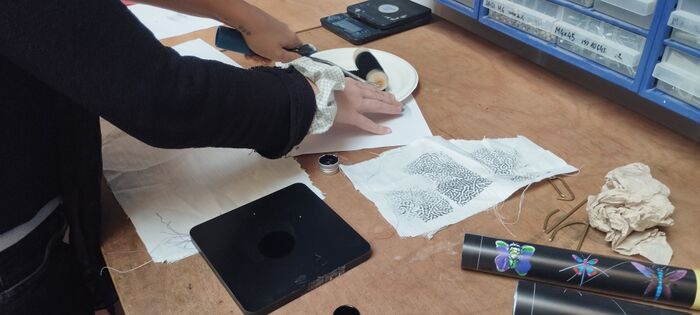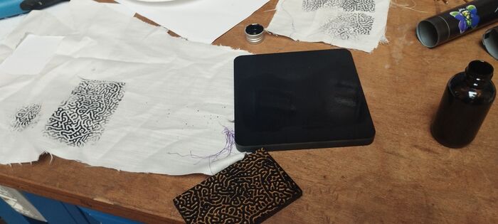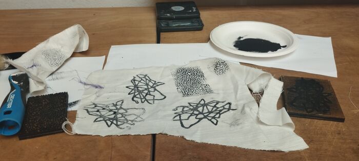 Les tampons ont été encrés à l'aide d'un rouleau encreur, puis pressés sur le coton jersey. Comme vous pouvez le voir sur les premières tentatives, pour obtenir de bons résultats, il est important que l'encre soit répartie uniformément sur la surface des tampons et que la pression exercée sur les différentes parties des tampons soit uniforme lors de l'impression sur le textile.