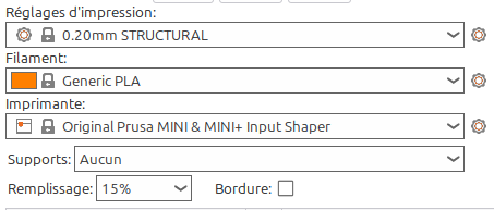 - D'autres paramètres sont disponibles dans les menus au dessus du plateau : la vitesse d'impression, la température de la buse, configurer des supports d'impression, des bordures, des options de refroidissement, etc. Pour obtenir de l'aide sur un paramètre, cliquez sur le nom de paramètre pour être redirigé vers le site d'aide Prusa.