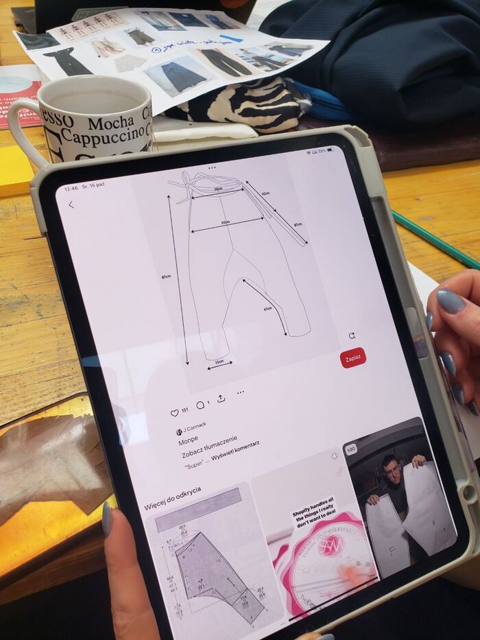 Martyna specified the place and number of buttons on the waist, and the shape of the waist (triangle with side openings) → and we had Sunita’s help for drawing the pattern.