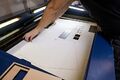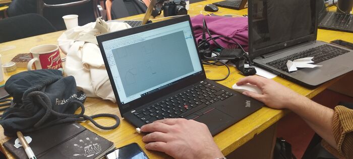 Une capture d'écran du logiciel Rhino, la découpeuse laser, la partie "dos" sortant de la découpeuse laser.