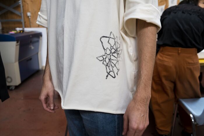 Pour découper les formes dans le coton, nous avons utilisé une découpeuse laser. En pliant le coton en deux, nous avons pu découper le patron en deux morceaux seulement (devant et dos) au lieu de plusieurs, malgré la surface de travail de la machine.