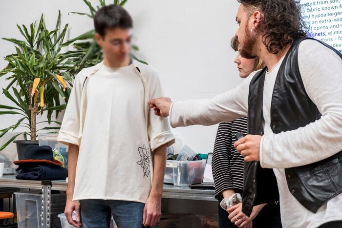 Pour voir comment le vêtement s'adapte, nous avons effectué quelques tests sur un modèle et déterminé ce qui devait être amélioré avant de passer à une autre itération. À ce stade, nous avons également reçu les commentaires et les conseils de Linda Zamboni.