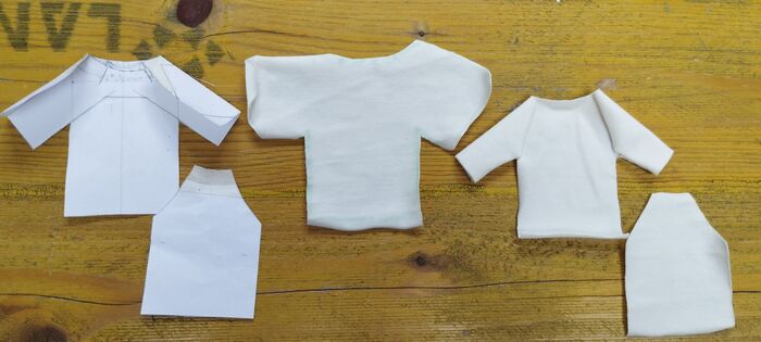 Après avoir passé en revue tous les documents produits lors du précédent atelier SeWith, nous avons commencé par fabriquer de nouveaux prototypes miniatures afin de tester différentes formes et combinaisons pour le haut. Nous avons d'abord réalisé un prototype en papier pour le devant et le dos du t-shirt. Puis nous en avons fabriqué un nouveau en tissu et l'avons cousu.