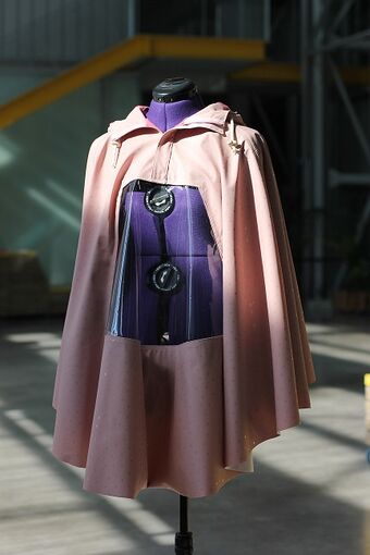 - La cape a été découpée en deux puis une fermeture éclaire traversant toute la cape jusqu'au bout de la capuche a été installée sur le milieu de la partie arrière pour pouvoir enfiler la cape.