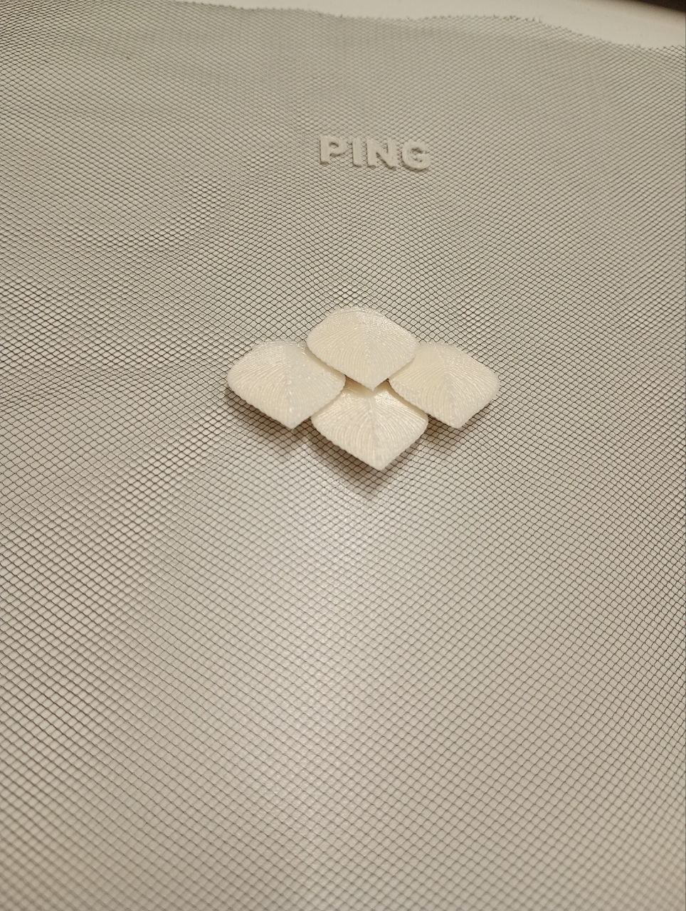 Photo de quatre écailles blanches imprimés en 3D sur du tulle noir